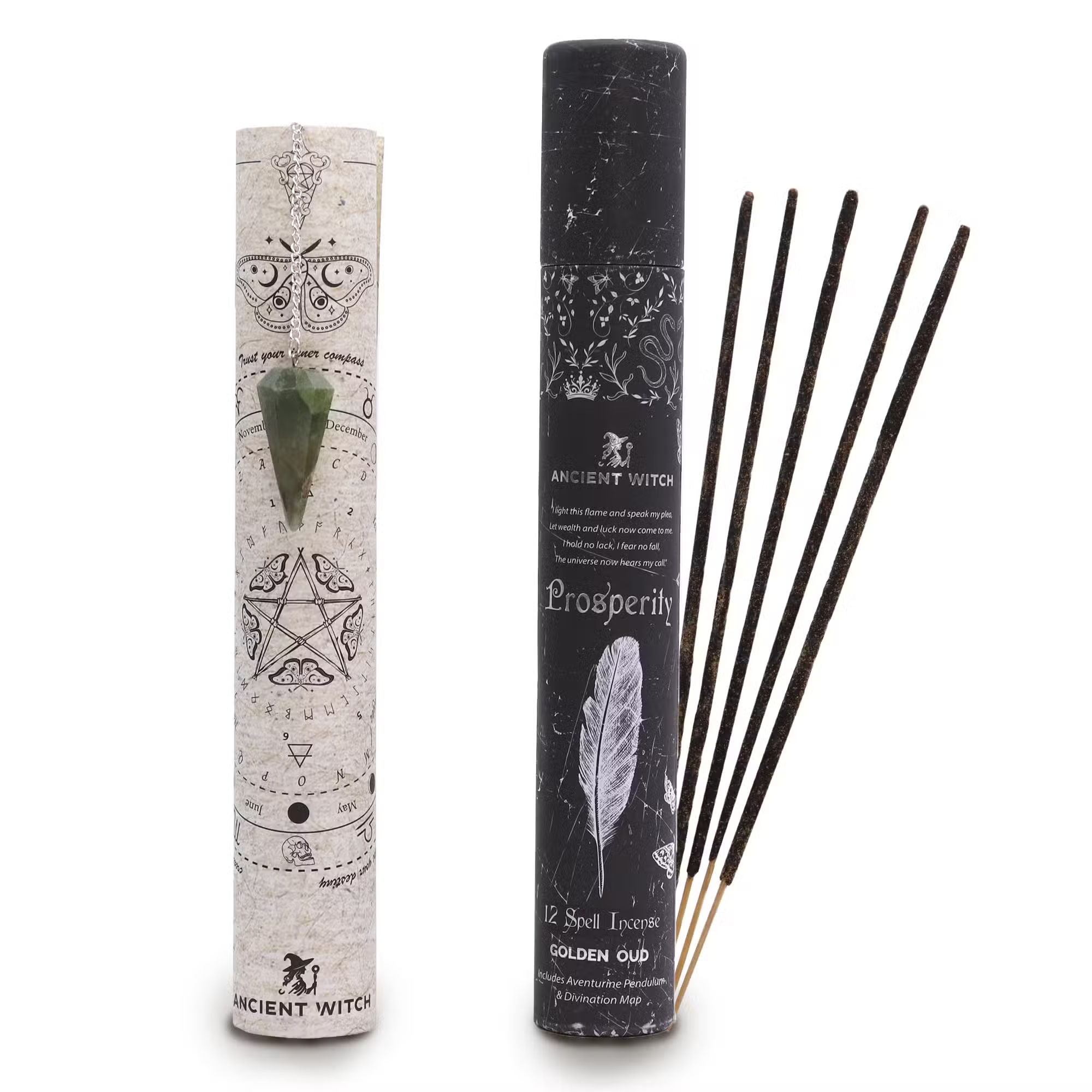 Invite more abundance into your space with this Prosperity Spell Incense. Golden Oud creates a warm, comforting scent while the aventurine pendulum and divination map add a ritual touch to your manifestation practice.
